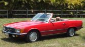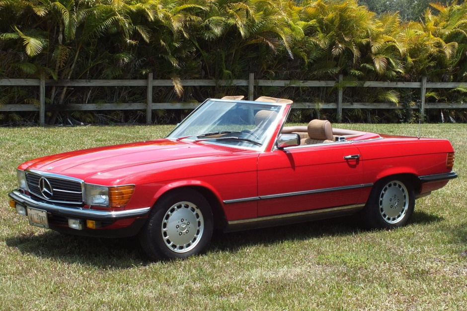 This 1985 Mercedes-Benz 280SL is a European-market example that was acquired by the seller in December 1993. The car is finished in Signal Red over a beige interior and is powered by a 2.7-liter M110 inline-six paired with a four-speed automatic transmission. Equipment includes a black soft-top, a body-color hardtop, headlight washers, anti-lock brakes, air conditioning, cruise control, power windows, and a Becker Mexico cassette stereo.
