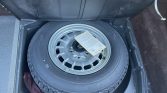 14″ Bundt-style wheels wear Michelin tires, and a spare wheel and tire are located beneath the trunk floor. The seller notes deterioration of the finish on the wheels.