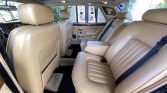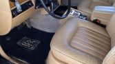 The cabin features seats upholstered in tan leather with a matching dashboard, door panels, and carpets along with burled wood trim on the doors and dash. Equipment includes air conditioning, an AM/FM/cassette stereo, a trunk-mounted six-disc CD changer, folding front armrests, power windows, and black Rolls-Royce-branded floor mats.