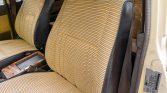 The cabin features seats upholstered in striped beige cloth and brown vinyl joined with matching door panel inserts and brown carpets. Amenities include manual windows, air conditioning, rear shoulder belts, and a Kenwood stereo with aftermarket speakers.