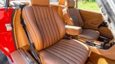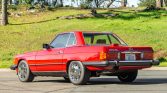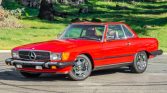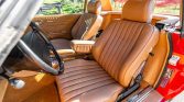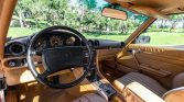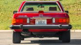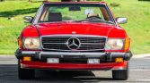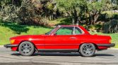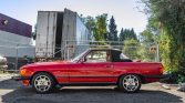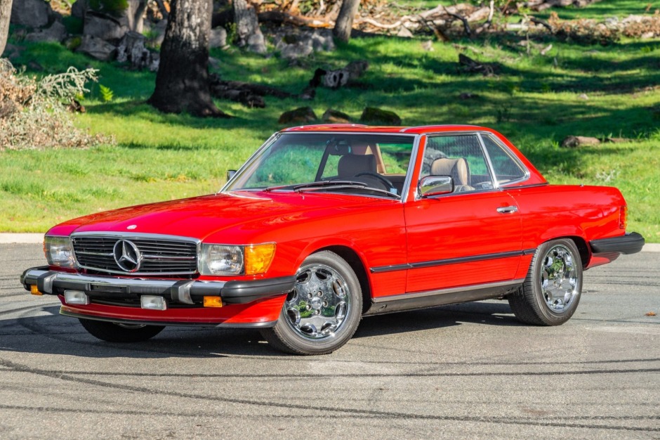 This 1986 Mercedes-Benz 560SL is finished in Signal Red over Palomino leather and is powered by a 5.5-liter V8 paired with a four-speed automatic transmission. Equipment includes a body-color removable hardtop, a black soft top, chrome-finished 16″ wheels, Euro-style headlights, fog lights, automatic climate control, cruise control, a Becker Grand Prix AM/FM/cassette stereo, central locking, and an alarm system.
