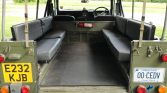 The right-hand-drive cab features twin front seats upholstered in black vinyl, and the inward-facing rear jump seats are upholstered in gray vinyl. Equipment includes dashboard vents, a center console with cupholders, two fire extinguishers, and rubber floor lining.