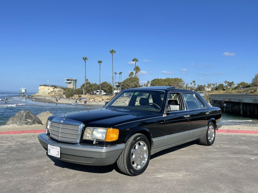 The SDL was 5.5″ longer than the standard W126, and this example is finished in Black (040) with contrasting lower cladding. Brightwork includes side moldings, bumper trim, and window surrounds, while additional equipment includes headlight wipers, fog lights, heated sideview mirrors, a power antenna, and a power sunroof.