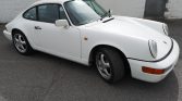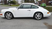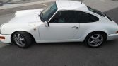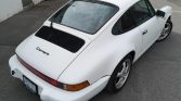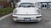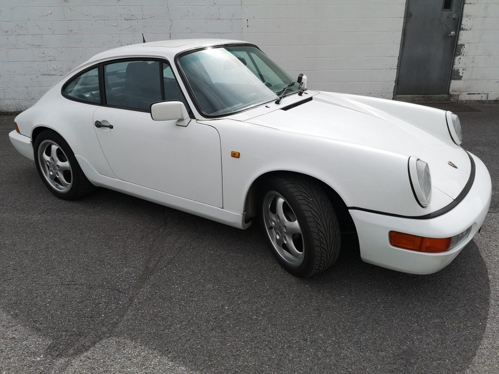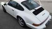 The car is finished in Grand Prix White with black accents and features 964-style front and rear bumpers.
