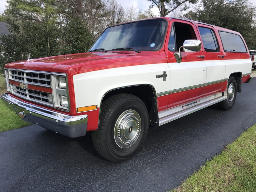 This 1988 Chevrolet Suburban 2500 Silverado is finished in Bright Red and White paint over red cloth upholstery, and power is provided by a fuel-injected 5.7-liter V8 paired with a three-speed automatic transmission. The truck spent most of its life in New York and it was acquired by the seller in November 2021. Equipment includes air conditioning, a third-row bench, running boards, a power rear window, and a receiver hitch.