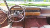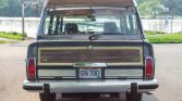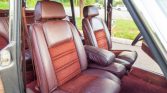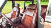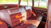The cabin features seats upholstered in burgundy leather with corduroy inserts joined by matching door panels and carpeting protected by Grand Wagoneer embroidered floor mats. Equipment includes wood trim, air conditioning, cruise control, a central glovebox, and power windows and locks. The seller states that refurbishment work under previous ownership included the replacement of the driver’s seat upholstery, carpets, headliner, and rear window motor.