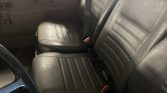 The interior features seats upholstered in gray vinyl with matching door panels and black rubber floor mats. Equipment includes power steering, air conditioning, an analog clock, inward-facing rear jump seats, a removable cargo partition, and a Blaupunkt cassette stereo. A crack is visible in the dashboard.
