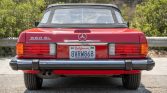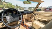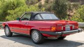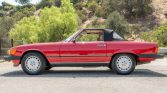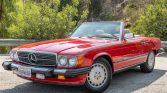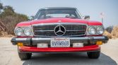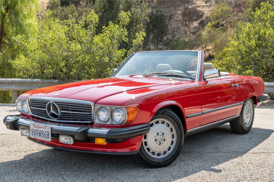 This 1989 Mercedes-Benz 560SL is finished in Signal Red over beige leather and is powered by a 5.5-liter V8 paired with a four-speed automatic transmission. Additional equipment includes a black convertible top, automatic climate control, cruise control, a Becker Grand Prix cassette stereo, heated seats, anti-lock disc brakes, and 15″ alloy wheels.