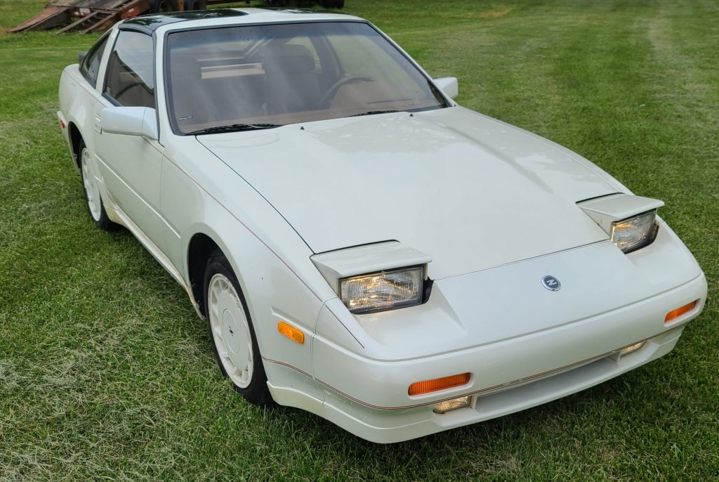 This 1989 Nissan 300ZX is finished in white over tan leather and powered by a turbocharged 3.0-liter V6 mated with a four-speed automatic transmission and a limited-slip differential. Features include color-coordinated 16″ wheels, adjustable suspension, removable glass T-top panels, a cassette stereo with a graphic equalizer, a power-adjustable driver’s seat, cruise control, and automatic climate control. The car was acquired by the seller’s grandmother in 1994, and service in preparation for sale included replacement of the distributor cap, spark plugs, ignition wires, and coil.