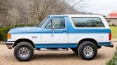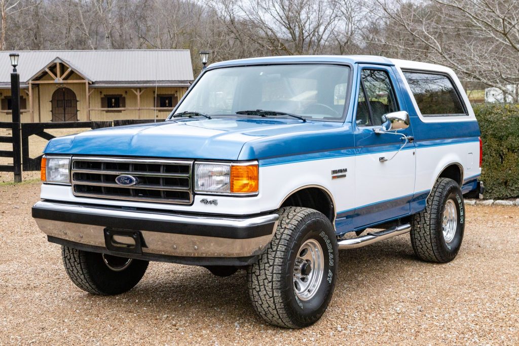 This 1991 Ford Bronco XLT has been registered in North Carolina since new and was acquired by the Tennessee-based seller in 2021. The truck is powered by a 5.0-liter V8 paired with a five-speed manual transmission and a dual-range transfer case and is finished in blue and white over a blue interior. Equipment includes a white removable hardtop, a power-operated rear window, cruise control, chrome aftermarket wheels, and a factory AM/FM cassette stereo. Work carried out by the seller is said to have consisted of refreshing the cooling and fuel systems as well as replacing the tires, exhaust system, rear main seal, and clutch kit.