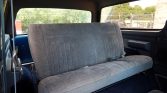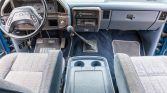 The interior features front seats with foldable armrests upholstered in blue cloth along with a matching rear bench seat. Faux wood trim accents the dash, and floor mats protect the blue carpets. Amenities include air conditioning, cruise control, a lockable center console, an AM/FM stereo with a cassette player, and power windows and door locks. According to the seller, the power window switch, rearview mirror, and window regulator have been replaced.