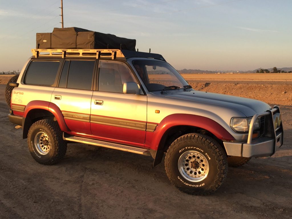 This 1991 Toyota Land Cruiser is a Japanese-market example that was imported to the US in early 2019 and acquired by the seller later that same year. The truck is finished in silver and red over gray cloth and powered by a 4.2-liter turbodiesel inline-six paired with a four-speed automatic transmission, a dual-range transfer case, and locking front, center, and rear differentials. Additional equipment includes 15″ wheels, cruise control, an altimeter, and a sunroof as well as a roof rack with a pop-up tent, an aftermarket front bumper with auxiliary lights, Old Man Emu shocks, and a Kenwood CD stereo. Service performed within the last year reportedly includes fluid changes and replacement of the tires, shocks and springs, and power steering pump.