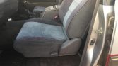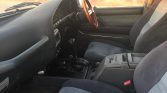 The right-hand-drive cabin features seating surfaces upholstered in dark gray cloth with light gray inserts, matching door panels, and all-weather floor mats. Amenities include an altimeter, a compass, cruise control, heated front seats, a sunroof, and a Kenwood CD stereo. Additional equipment from Japan consists of a turbo timer and a Japanese Electronic Toll Collection card slot. Aftermarket pedal covers have been added, and a switch for the auxiliary lights is mounted to the right of the ignition cylinder. The seller reports that the cruise control works intermittently, the air conditioning has a refrigerant leak, and the left-front window rolls up slowly in cold ambient temperatures.
