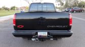 The truck is finished in Onyx Black with matching trim and 454 SS logos on the rear fenders. Exterior features include dual exhaust outlets, a front air dam with fog lights, tinted windows, and a sliding rear window. A Goodmark 2″ cowl induction hood and a Draw-Tite frame-mounted receiver hitch have been fitted. The seller notes that the front left fender and front bumper were damaged in 1992 and replaced, which included powder-coating the replacement bumper, and there is damage underneath the the left side of the rear bumper.