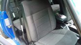 The cabin features seating upholstered in two-tone gray cloth with a matching dashboard, door panels, and carpeting. Additional features include power windows, power door locks, air conditioning, a locking glovebox, an aftermarket AM/FM/CD stereo, and a relocated trunk-release button.