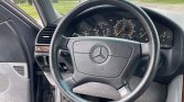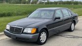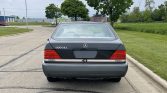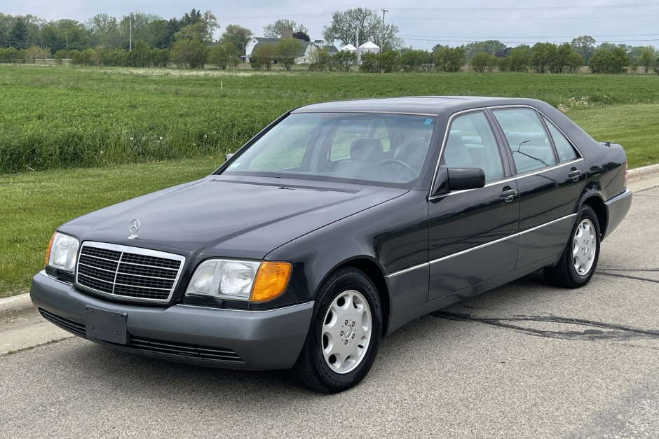This 1992 Mercedes-Benz 500SEL is finished in Black Pearl Metallic over gray leather and is powered by a 5.0-liter V8 paired with a four-speed automatic transmission. Equipment includes a self-leveling suspension, a power sunroof, heated and power-adjustable front and rear seats, dual-zone automatic climate control, a Becker cassette stereo with a CD changer, and a soft-closing trunk lid and doors.