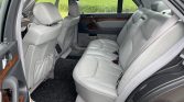 The cabin features seats upholstered in gray leather with matching door panels and carpets along with burred walnut trim on the doors, dashboard, and center console. Equipment includes heated and power-adjustable front and rear seats, dual-zone automatic climate control, cruise control, rear vanity mirrors, and power windows, locks, and mirrors.
