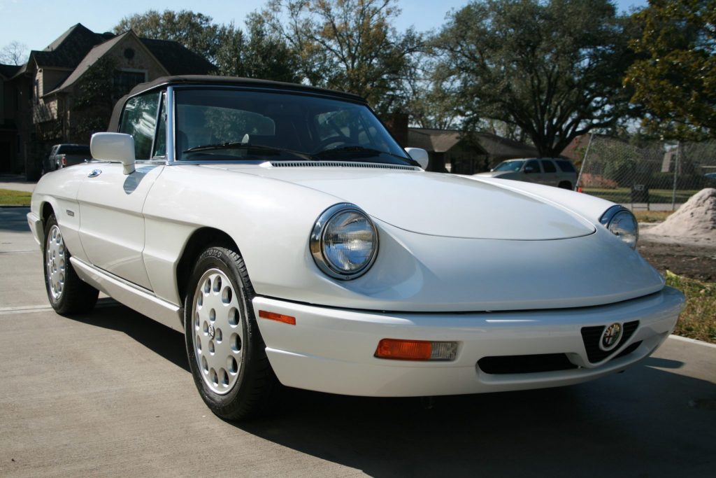 This 1993 Alfa Romeo Spider Veloce was delivered new at Lochmoor Chrysler-Plymouth-Alfa Romeo of Detroit, Michigan, and was reportedly acquired by the seller from its first owner in 2011. The car is finished in white over black leather and is powered by a 2.0-liter inline-four paired with a five-speed manual transmission. Equipment includes a black soft top with a matching boot, air conditioning, 15″ alloy wheels, a cassette stereo, and power windows.