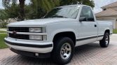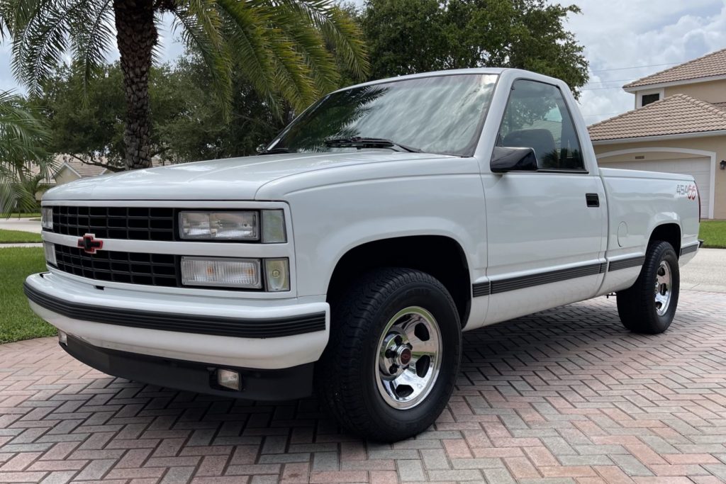 This 1993 Chevrolet 454 SS pickup is finished in white over red cloth and is powered by a 454ci V8 paired with a four-speed automatic transmission and a limited-slip differential. Features include the Performance Handling Package, chrome 15″ steel wheels, and 454 SS graphics. The seller acquired the truck in 2020 and subsequent modifications included repainting the grille and installing an aftermarket antenna and wheel spacers.