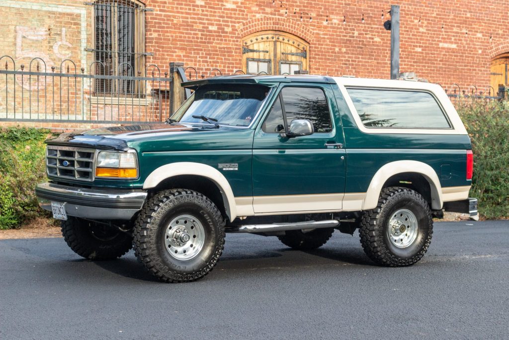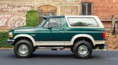 This 1993 Ford Bronco is an Eddie Bauer example that is finished in two-tone metallic green and beige over beige cloth upholstery. Power is provided by a replacement 302ci V8 paired with a four-speed automatic transmission and a dual-range transfer case. Equipment includes a removable fiberglass hardtop, 15″ alloy wheels with 35″ tires, lifted suspension, air conditioning, front captain’s chairs, and a JVC stereo. The truck was first registered in New Jersey and later spent time in Pennsylvania and Texas before being acquired by the seller in September 2020. Subsequent work has included replacement of the engine, fuel pump, and exhaust muffler.