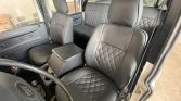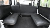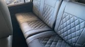 The front bucket seats are trimmed in black leather with quilted inserts, and matching upholstery extends to the second-row bench and inward-facing rear benches. A lockable center console with cupholders is fitted between the front seats.