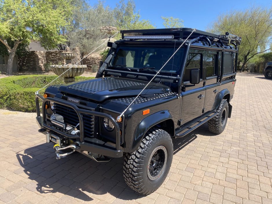 This 1993 Land Rover Defender 110 is number 143 of 500 North American Specification examples imported to the US for the model year. It is finished in black over black and is powered by a 2.8-liter TGV turbodiesel inline-four with an upgraded turbocharger paired with a five-speed manual transmission, dual-range transfer case, and an ARB locking differential. Equipment includes a front brush guard, front skid plate, winch, bead lock wheels, Fox external-reservoir shocks, a snorkel intake system, rock sliders, LED lights, quick-disconnect rear sway bar, an auxiliary fuel tank, a high-lift jack, Alcantara headliner, heated front seats, air conditioning, a CB radio, a Kenwood stereo, Bose speakers, and a custom dash with replacement instruments.