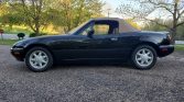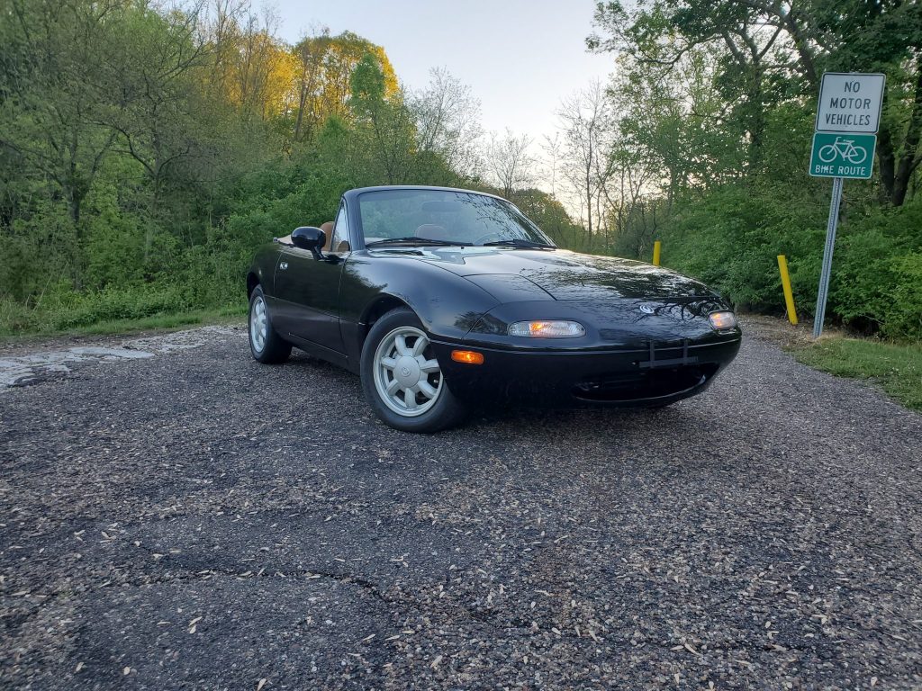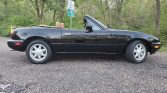 This 1993 Mazda MX-5 Miata is finished in black with a tan convertible top, and it is powered by a 1.6-liter inline-four paired with a five-speed manual transmission. Optional equipment includes air conditioning, carpeted floor mats, a limited-slip differential, and Package C, which added power steering, tan leather upholstery, cruise control, a leather-wrapped steering wheel, and power windows and mirrors. Recent service is said to have included replacing the battery along with the oil and air filters.
