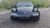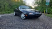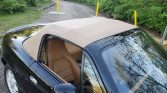 The car is finished in Brilliant Black (PZ), and the optional Package C added a tan convertible top and boot cover as well as a power antenna. Other equipment includes a body-color rear spoiler, body-color power side mirrors, and pop-up headlights. Scrapes are noted underneath the front bumper, and scratches can be seen in the paintwork.