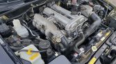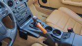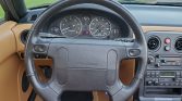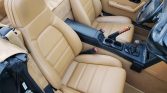 The cabin features high-back bucket seats with headrest speakers and tan leather upholstery along with matching door panels, carpets, floor mats, and a black center console and upper dashboard. Equipment includes air conditioning, cruise control, power windows, and a Panasonic AM/FM stereo and cassette player. Fold-away cup holders have been mounted on both sides of the transmission tunnel.