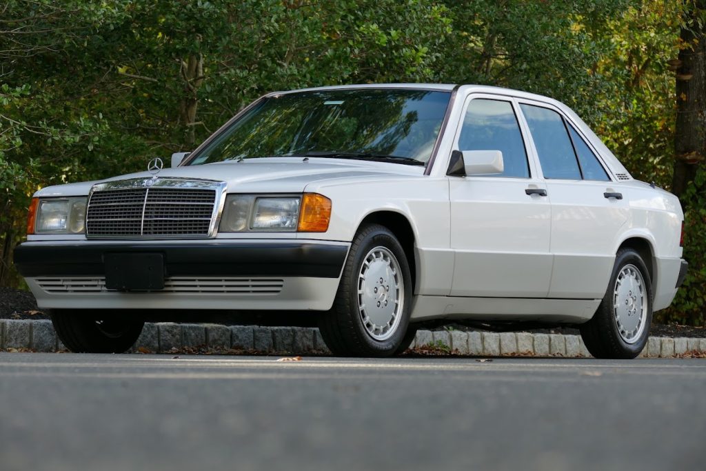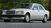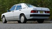 This 1993 Mercedes-Benz 190E is powered by a 2.6-liter inline-six paired with a four-speed automatic transmission and is finished in white over gray MB-Tex upholstery. Equipment includes an electric sunroof, automatic climate control, cruise control, an AM/FM cassette stereo, power-adjustable front seats, and 15″ alloy wheels.