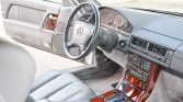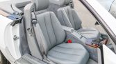 The cabin is upholstered in gray leather and features burl wood trim on the center console and doors. Additional equipment includes automatic climate control, cruise control, a Bose AM/FM cassette sound system, a deployable roll bar, Mercedes-Benz branded floor mats, and power windows, mirrors, and door locks.