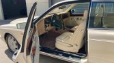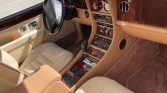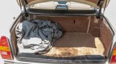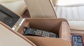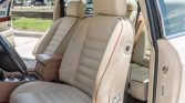 The interior features seating surfaces upholstered in beige leather with brown piping as well as burl wood trim on the dashboard, door panels, and center console. A locking console for the rear passengers includes a chrome ashtray and cigar lighter, and additional amenities include power-adjustable heated front seats with position memory, automatic climate control, a mobile phone, and a cassette stereo.