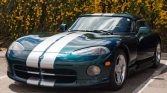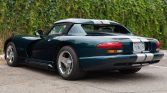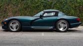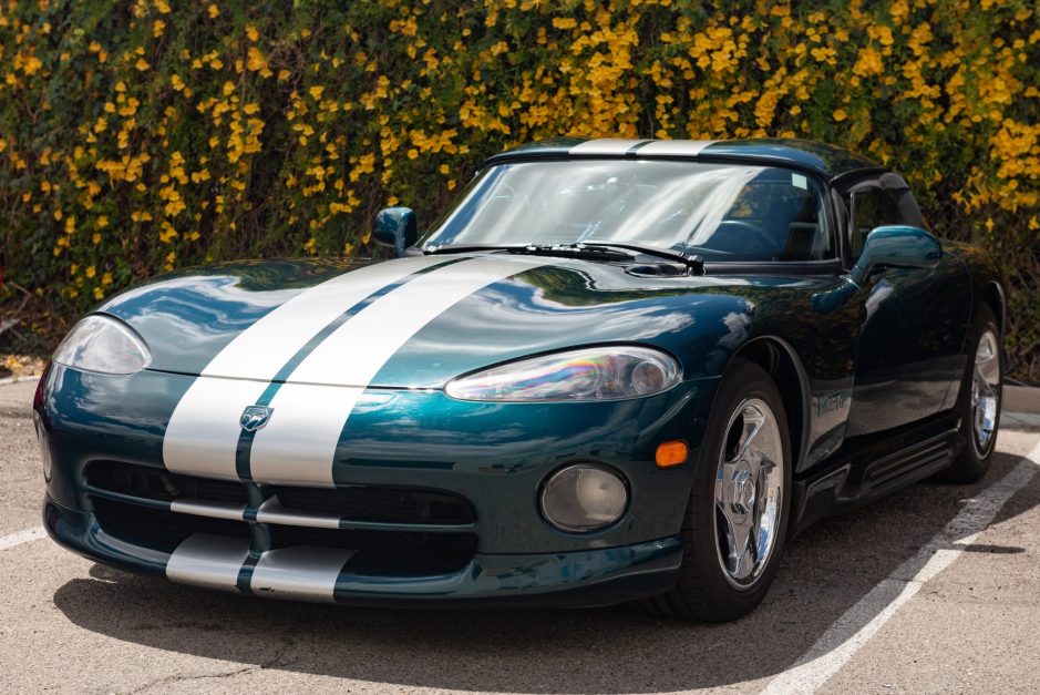 This 1995 Dodge Viper RT/10 roadster is one of approximately 440 first-generation Vipers finished in Emerald Green Metallic over gray leather and powered by an 8.0-liter V10 paired with a six-speed manual transmission. Equipment includes a limited-slip differential, air conditioning, an Alpine stereo, a body-color removable roof panel, fog lights, 17″ wheels, and a removable canvas soft top and side curtain windows.
