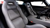 The seating surfaces are upholstered in gray leather, and additional cabin trim includes a matching dashboard, center console, and door inserts as well as black carpets are protected by gray floor mats. Amenities include air conditioning, an Alpine CD stereo, and a leather-wrapped shifter and parking brake handle.