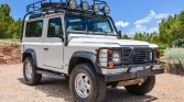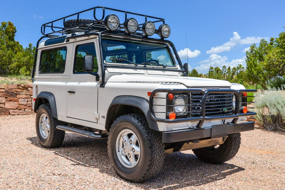 This 1995 Land Rover Defender 90 is one of approximately 500 North American-Specification station wagon examples imported into the US for the model year and is finished in Alpine White over Ash Gray Houndstooth cloth and vinyl. Equipment includes a roll cage, a roof rack, a front brush guard, a pop-up glass sunroof, auxiliary lights, 16″ five-spoke wheels, and tubular side steps along with air conditioning, an AM/FM/cassette stereo, and inward-facing rear jump seats. Power is provided by…