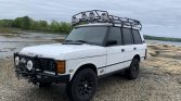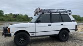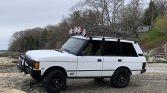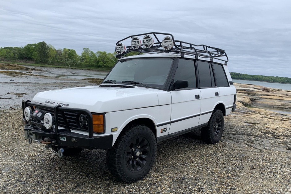 This 1995 Land Rover Range Rover Classic is finished in white over tan leather and powered by a 3.9-liter V8 paired with a four-speed automatic transmission and a dual-range transfer case. The truck was first registered in California and spent time in several states before being acquired by the seller in 2021. Features include fog lights, a sunroof, dual-zone climate control, a 2″ suspension lift, an ARB front bumper, a Warn winch, a roof rack with Hella lights, and 16″ sawtooth wheels. Work under current ownership has consisted of replacing the amplifier and wiring, radiator and sway bar end links and bushings as well as installing a Sony stereo and LED headlights.