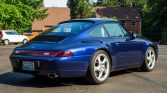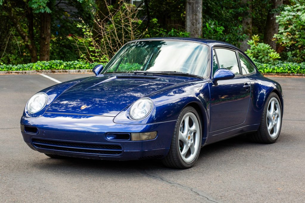 This 1995 Porsche 911 Carrera coupe wears a repaint in Iris Blue Metallic over a Marble Grey, Midnight Blue, and black interior, and it is powered by a 3.6-liter flat-six that has been fitted with a Steve Wong ECU chip. The car was specified with a six-speed manual transaxle and a limited-slip differential, and additional equipment includes an FD Motorsports Golden Rod kit, a lightweight flywheel, 18″ Turbo Twist wheels, M033-specification springs, Koni shocks, Walrod control arm bushings, LED headlights, smoked lighting lenses, and an aftermarket sound system.