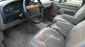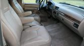 The cabin features front captain’s chairs and a rear bench upholstered in Medium Mocha leather with a matching dashboard, door panels, and carpets. Amenities include power windows and locks, air conditioning, cruise control, push-button four-wheel drive, and a factory cassette stereo. The interior door handles are said to have been replaced in June 2021.