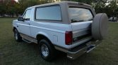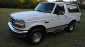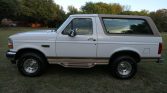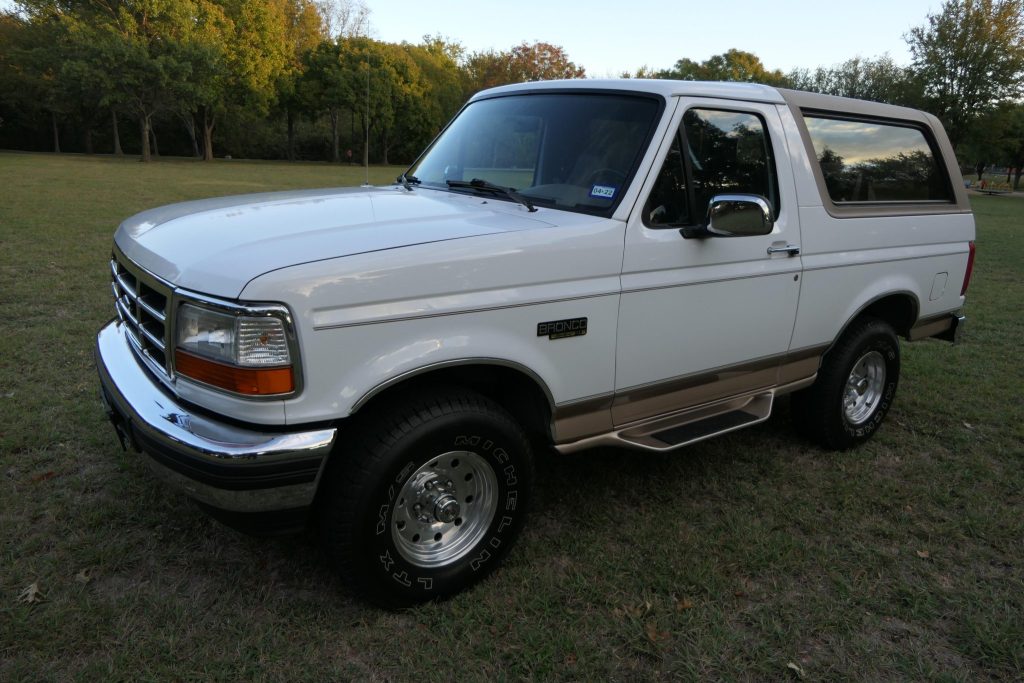 This 1996 Ford Bronco Eddie Bauer is is finished in white with a tan hardtop over brown leather and is powered by a 5.8-liter V8 paired with a four-speed automatic transmission and a two-speed transfer case. Equipment includes 15″ alloy wheels, side steps, a swing-out spare tire carrier, power windows and locks, and a cassette stereo. Service performed under current ownership has reportedly included replacement of the coolant expansion tank, ABS pump module, rear sway bar bushings, headlights, and battery.