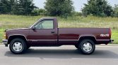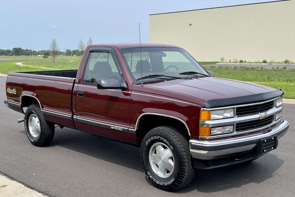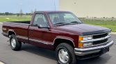 This 1998 Chevrolet Silverado K1500 is a standard-cab long-bed example that is finished in Dark Hunt Club Red Metallic over red cloth and powered by a 5.7-liter V8 mated to a four-speed automatic transmission and a dual-range transfer case. Equipment includes a receiver hitch, cruise control, air conditioning, 16″ alloy wheels, a sliding rear window, and an AM/FM cassette stereo. The truck spent time in Ohio, New York, and Pennsylvania before being acquired by the seller in July 2021.