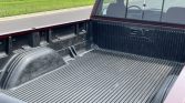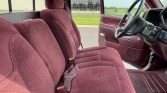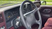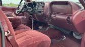 The cab features a split-bench seat upholstered in red cloth along with matching carpets and door panels. Amenities include a fold-down center console, air-conditioning, an AM/FM cassette stereo, cruise control, and power accessories.