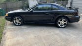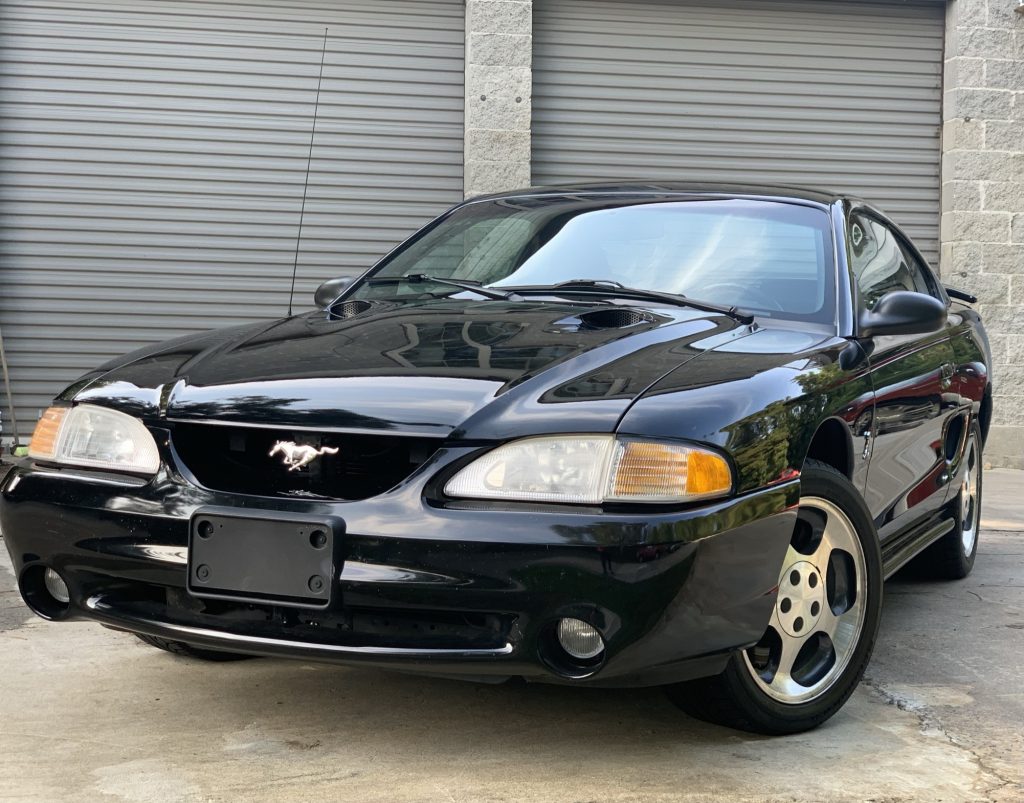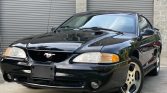 This 1997 Ford Mustang SVT Cobra is finished in black over matching leather and is powered by a 4.6-liter V8 paired with a five-speed manual transmission and a limited-slip differential. Equipment includes fog lights, a dual-vented hood, a fixed antenna, 17″ alloy wheels, a rear spoiler, a stainless steel exhaust system, air conditioning, cruise control, and an AM/FM/CD/cassette stereo.