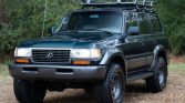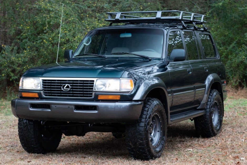 This 1997 Lexus LX450 spent time in Florida, Virginia, and South Carolina prior to being acquired by the seller in August 2021. The truck is finished in Dark Emerald Pearl over Oak leather upholstery and is powered by a 4.5-liter inline-six mated to a four-speed automatic transmission and a dual-range transfer case. Equipment includes an automatic-locking center differential, IronMan 4×4 suspension lift, 17″ Pro Comp wheels, a roof basket, a retractable canopy with LED lighting, running boards, tinted windows, third row seats, and a sunroof. Service in January 2022 consisted of a tune-up and A/C service, as well as replacement of the heater core, EGR valve, power steering pump, rear brake rotors, and front brake pads.