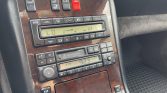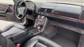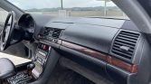 The cabin features seating trimmed in black Nappa leather with matching carpets, and burl wood veneers aLent the dashboard, center console, and door panels. Amenities include heated and power-adjustable front seats, an electric rear window shade, dual-zone automatic climate control, cruise control, and a Mercedes-Benz Exquisit cassette stereo.