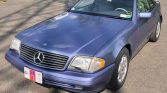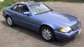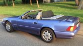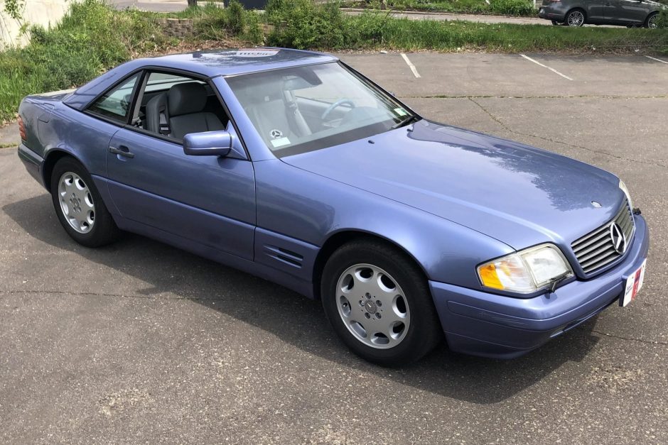 This 1997 Mercedes-Benz SL320 is one of 250 40th Anniversary Roadsters finished in Quartz Blue Metallic paint over a gray Exquisite leather interior. Power is from a 3.2-liter inline-six paired with a five-speed automatic transmission, and equipment includes a dark blue convertible top, 16″ wheels, heated power-adjustable seats, Royal Maple wood trim, and a six-disc CD changer.