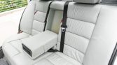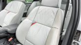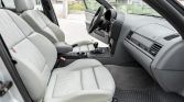 The seating surfaces are upholstered in light grey Nappa leather which extends to the door panel inserts and is complemented by a grey dashboard, door panels, and carpeting. Amenities include heated sport seats, dual-zone automatic climate control, a factory cassette stereo with a trunk-mounted CD changer, an onboard computer, power windows, and cruise control.