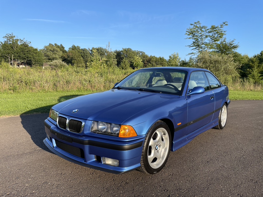 The previous owner has refinished this 1999 BMW M3 coupe in Estoril Blue Metallic, retrimmed the headliner in Alcantara, refreshed the cooling system, and replaced the valve cover gaskets, ignition components, and the tires. The car is powered by a 3.2-liter inline-six paired with a five-speed manual transmission. The interior is trimmed in Light Gray Nappa leather, and additional features include a limited-slip differential, a sunroof, 17″ Style 23 wheels, heated power-adjustable Vader sport seats, a remote six-disc CD changer, a Harman Kardon sound system, and dual-zone automatic climate control.