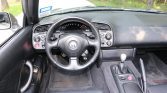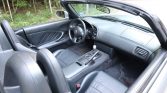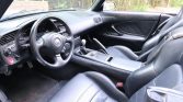 The cabin features bolstered seats trimmed in black leather with a matching dashboard, door panels, and carpets. S2000-embroidered floor mats line the footwells, and amenities include air conditioning, power aLessories, cruise control, an aluminum shift knob, and an AM/FM/CD stereo behind a flip-face cover in the center stack.