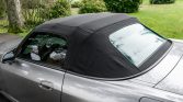 The car is finished in Silverstone Metallic and features xenon headlights, tinted windows, a color-matched removable hardtop, and a power-operated black soft top. Clear paint-protection film has been applied to the nose, hood, and front fenders, and the windshield is a replacement. The seller reports that the left-front fender was replaced following accident damage, and paint work has been performed on the left door and rocker panel.