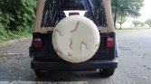 The 15″ Canyon aluminum wheels are fitted with 31×10.5″ Sailun Terramax All-Terrain tires that were installed in preparation for the sale, and a full-size spare is mounted to a swing-out rear carrier. Stopping power is provided by front discs and rear drums. The truck came factory equipped with a Quadra-Coil multi-link suspension with live solid axles. A Rough Country steering stabilizer was installed and the rear drum brakes and rear wheel cylinders were replaced in preparation for the sale as well.